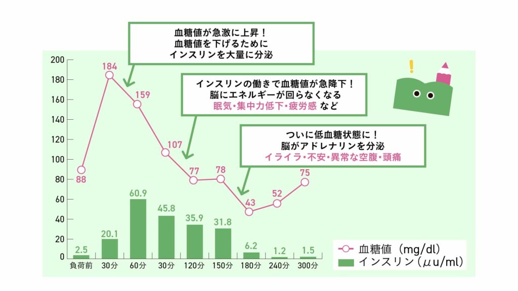 甘いものを食べると血糖値は急上昇します。すると体は「下げなきゃ!」とインスリンをたくさん出し、今度は急降下。 この“乱高下”が繰り返されることで、眠気や強い空腹感、さらにはイライラや不安感を引き起こします。