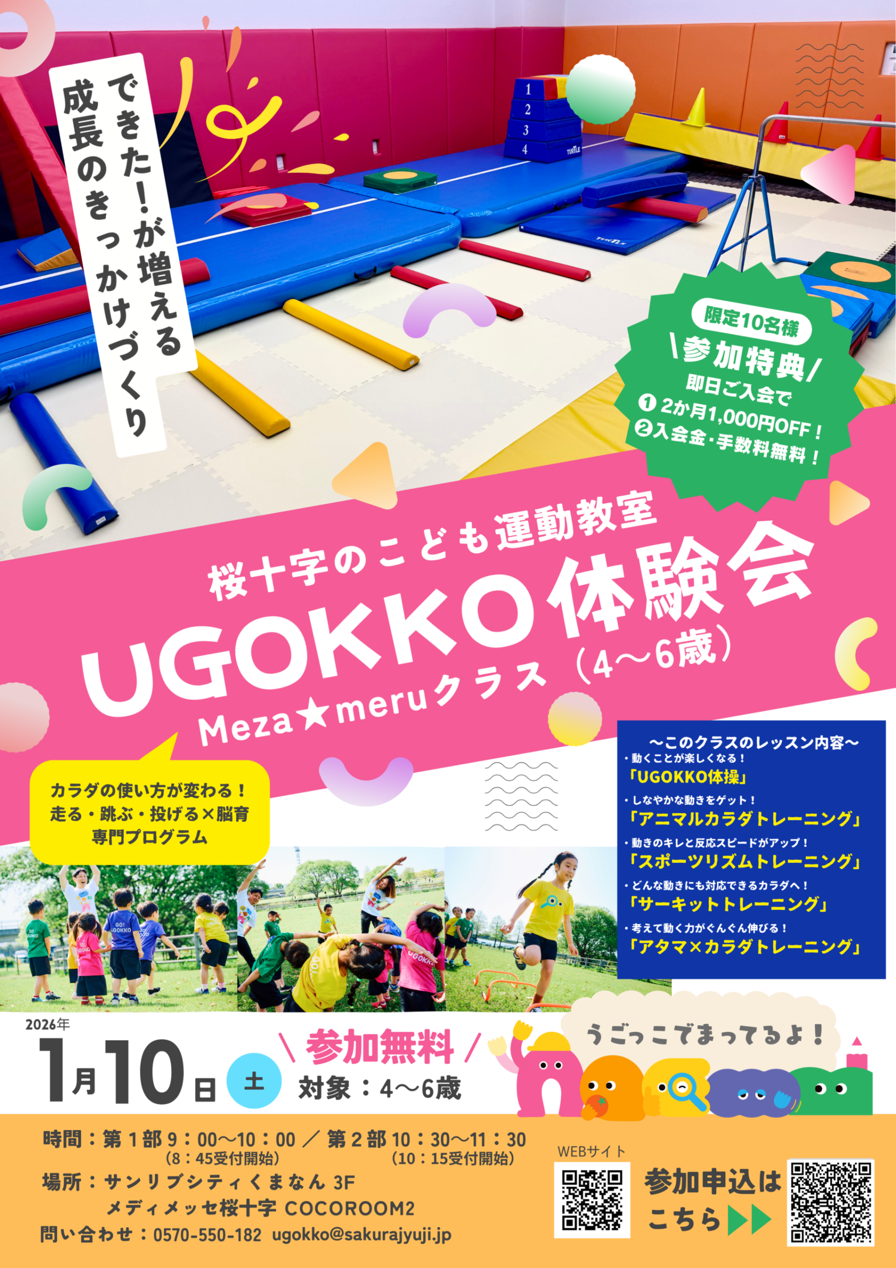 桜十字のこども運動教室「UGOKKO(うごっこ)」では、4〜6歳のお子さまを対象にした Meza★meruクラス体験会 を開催します。