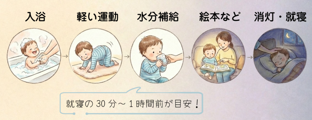 ※1:水分は寝る直前ではなく、30分〜1時間前を目安に。量は50〜100ml程度でOKです(飲みすぎるとトイレで目が覚める子もいるので、心配な日は少なめに)。