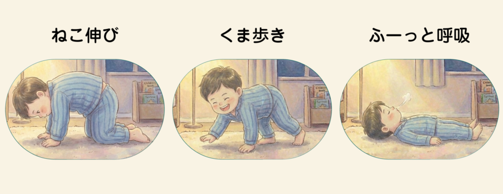 ゆっくり息を吐くことで、さっきまで元気だった体がふっと落ち着いて、力が抜けやすくなります。これだけで寝つきがスッと変わる子もいますので、ぜひ親子で試してみてくださいね!