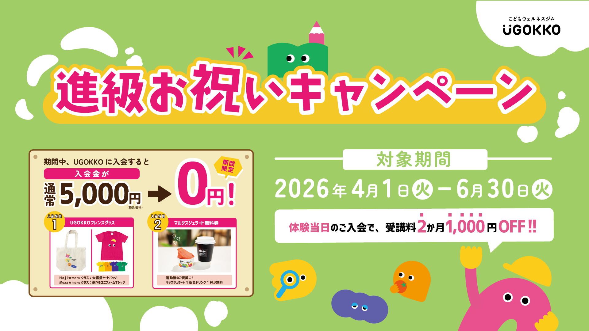 期間中にUGOKKOへご入会いただくと、入会金 通常税込 【5,000円】が【0円】になります!